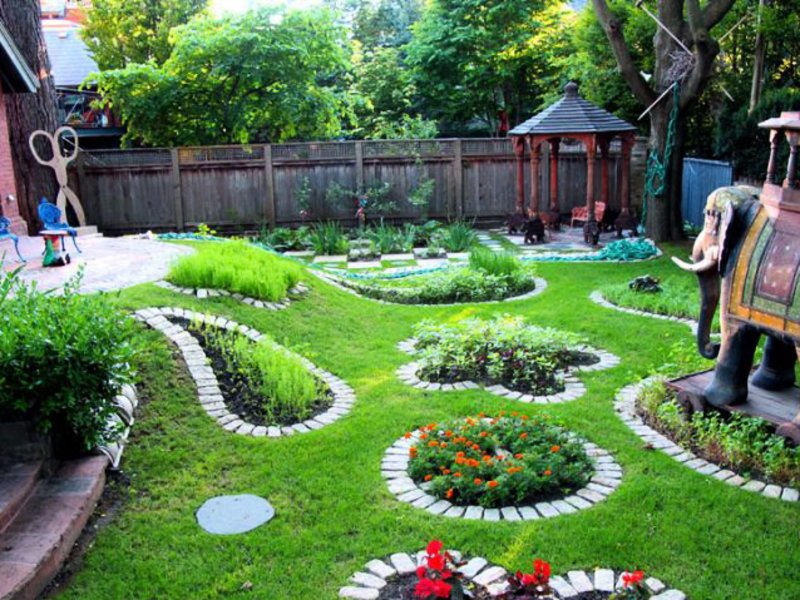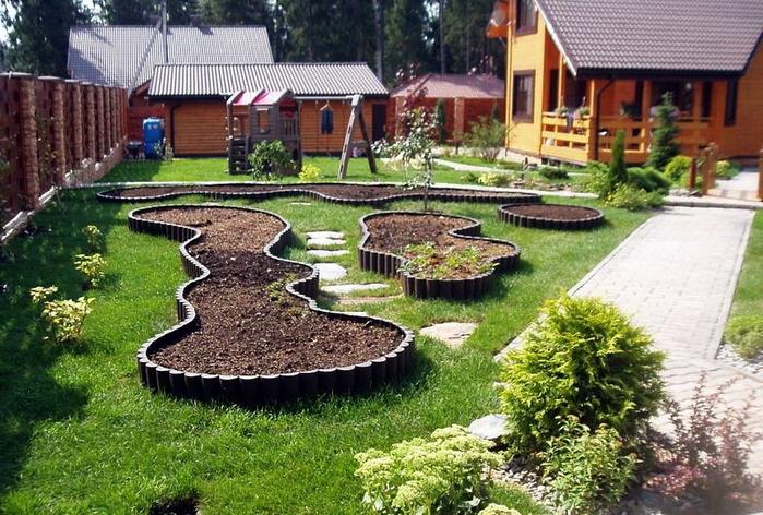 Als je nog steeds niet over de stijl kunt beslissen, of als je er geen leuk vindt, versier hem dan niet door intuïtie. Gebruik gazons, rozentuinen, sierbloembedden (in de vorm van patronen), randen, decoratieve stenen, droge beken gemaakt van speciaal materiaal, priëlen, hekken, struiken, een verscheidenheid aan perlogs, banken, rutaria, verticaal tuinieren, enz. Zelfs een mooie stomp die je kunt vinden vind uw plaats op de site.