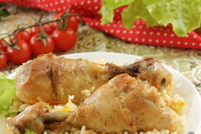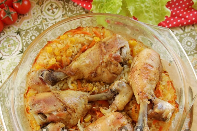 We sluiten de vorm met een deksel (of folie) en plaatsen in de oven voorverwarmd tot 200 graden C. Bak gedurende 1 uur. Aan het einde van het bakproces wordt alle vloeistof geabsorbeerd, wordt de rijst zacht en kruimelig en wordt de kip zacht en zacht.