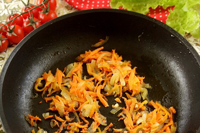 Schil de uien en wortels. Grondig spoelen. Snijd de uien in dunne halve ringen, wrijf de wortels op een grove rasp. We verwarmen de pan goed met plantaardige olie en verspreiden de groenten. Bak uien met wortels tot ze zacht zijn, gedurende 8-10 minuten, op laag vuur onder een deksel.
