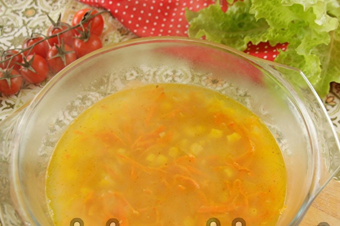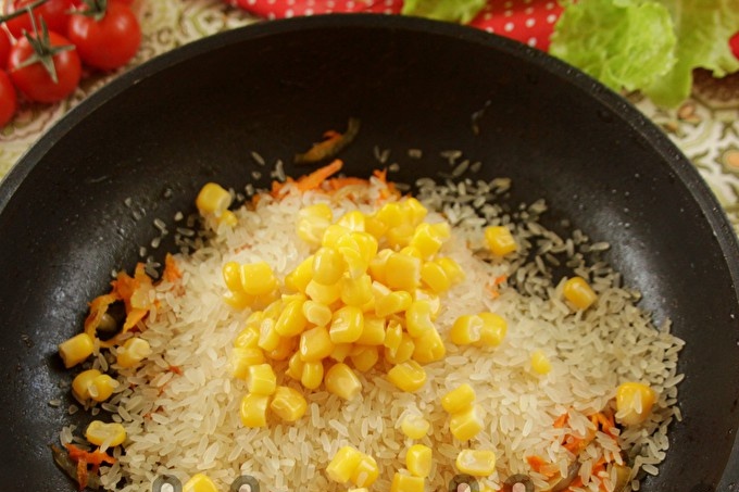 We wassen de rijst in 2-3 wateren. Voeg rijst en maïs toe aan de wortels met uien, een beetje zout.