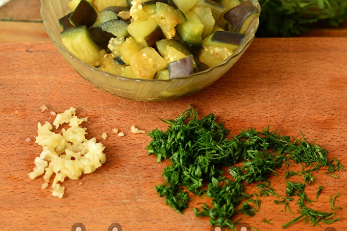 We gieten de aubergine met de resulterende marinade, waaraan we knoflook en dille toevoegen.