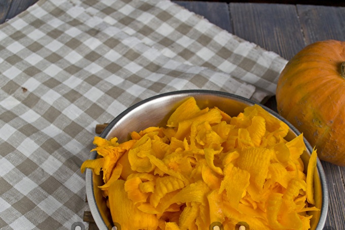 Schil de oranje pompoen. Verwijder een eetlepel zaden en zacht vruchtvlees. Maal de dikke pulp - wrijf op een grove rasp of snijd in kleine blokjes.