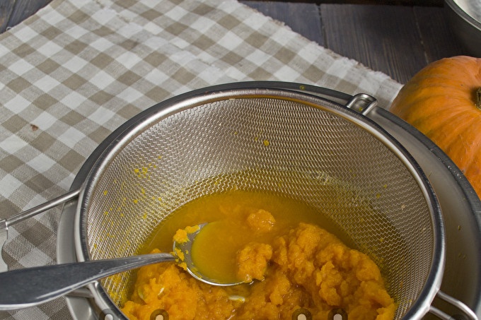 Veeg vervolgens de gekookte pompoen door een zeef - op deze manier kun je zaden verwijderen en restjes schillen die per ongeluk zijn gevallen. Als je zeker weet dat er geen vreemde insluitsels zijn, snijd je de groenten in een blender.