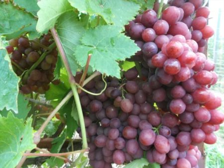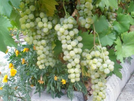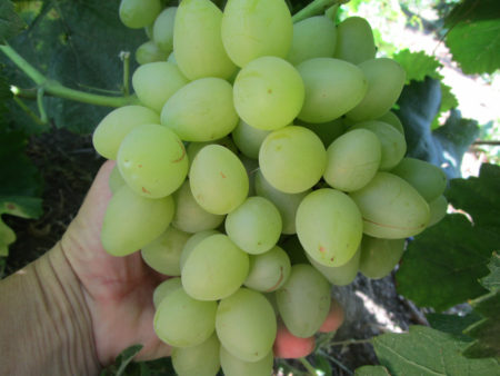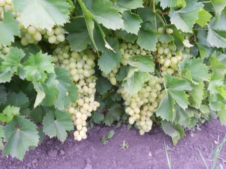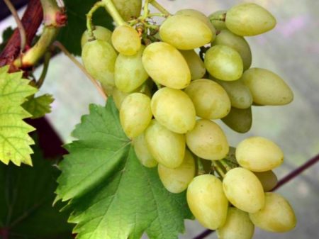 De struik groeit snel, er is niet veel groene massa, clusters zijn klein, van verschillende vormen, de bessen zijn lichtgroen, klein met 4-5 zaden erin. Maar de smaak is zoet met een lichte zuurgraad. Het suikergehalte is 17-17,5%. Het gewicht van één borstel bereikt gemiddeld 250 g, maar kan 470 g bereiken.