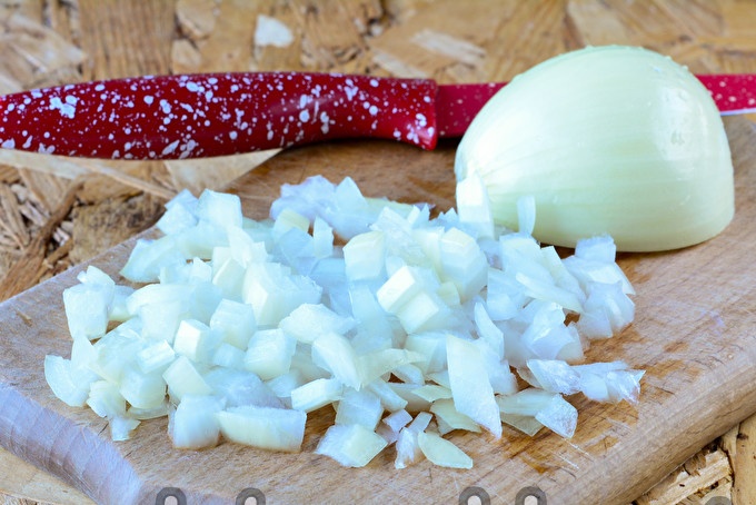 Schil de uien terwijl u aardappels kookt, spoel ze af en snijd ze in kleine blokjes.
