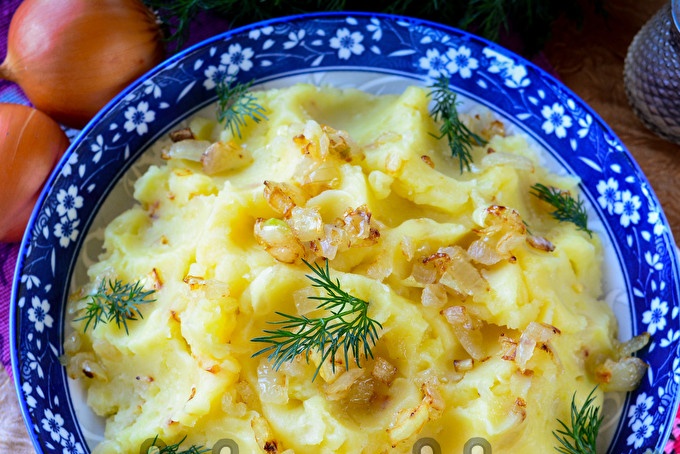Roer aardappelpuree met gebakken uien. Giet de boter met uien in aardappelpuree. Dankzij de olie worden de aardappelen zachter en malser. Proef de vulling, voeg indien gewenst een beetje zout en zwarte peper toe.