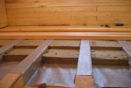 Om vloerisolatie uit te voeren, zijn vertragingen in de fundering geïnstalleerd. Vervolgens worden schilden aan de balk genageld en worden hydro- en dampbarrière, isolatie en beide isolatie geïnstalleerd.