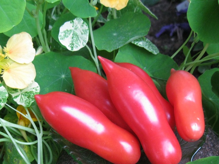 - Kibits. In Rusland worden de zaden van deze tomaat gekocht bij verzamelaars. Het is een lage struik met een dikke stengel en krachtige wortels. Bereikt 0,6 m hoog, tijdens de rijping claimt een kousenband, anders kan het breken onder het gewicht van de vrucht. Het wordt beschouwd als een ultra-vroege tomaat. De vruchten worden rood in 80-90 dagen na het verschijnen van de zaailing. Vruchten met een cilindrische vorm met een neus aan het einde, tot 12 cm lang, zoetzure smaak. Het gewicht van 1 tomaat is van 60 tot 80 g. Het is raadzaam om ze te gebruiken voor het bewaren en drogen vanwege de kleine grootte van het fruit. Bestand tegen transport.
