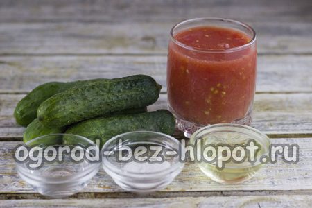 Hoe komkommers met tomatenpuree te koken voor de winter