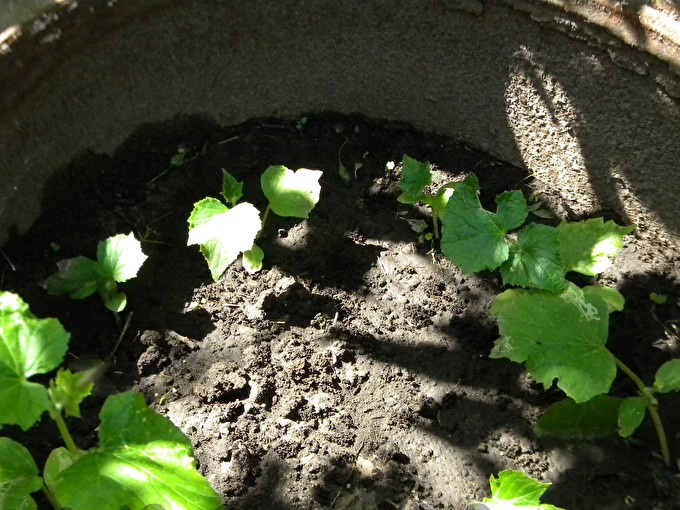 Dus het vat is gevuld met aarde, het nieuw gemaakte bed is bewaterd en klaar om te gaan. Maak langs de omtrek van het bed kleine gaatjes in de grond (bij stukjes 10), dompel de zaden van wevende komkommers erin en bestrooi met aarde. De eerste keer water geven is niet nodig om de zaden niet van de grond te wassen. Over een paar weken zie je in het vat al struiken van komkommers "beginnen".