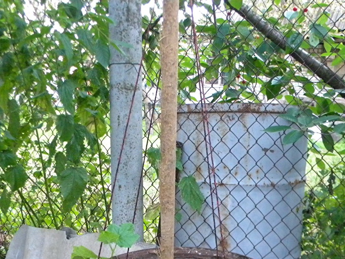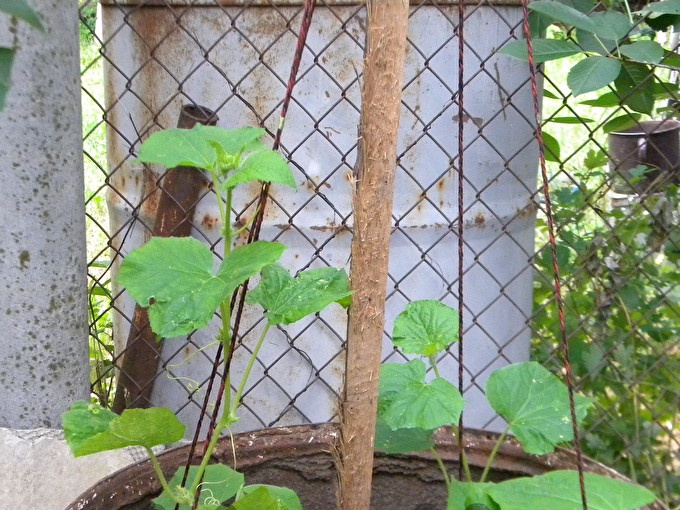 Wanneer je ziet dat de struiken al beginnen te weven (te lang worden en op het punt staan te vallen), zorg dan voor een ondersteuning voor de komkommers. In het vat is er genoeg, slechts één lange stok, in het midden gegraven, en vier touwen die van de "voet" van de struiken naar de stok leiden. Dit is een soort "ladder" voor planten, die zal helpen om een houten steun te beklimmen.
