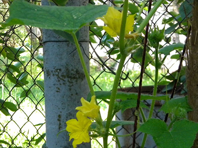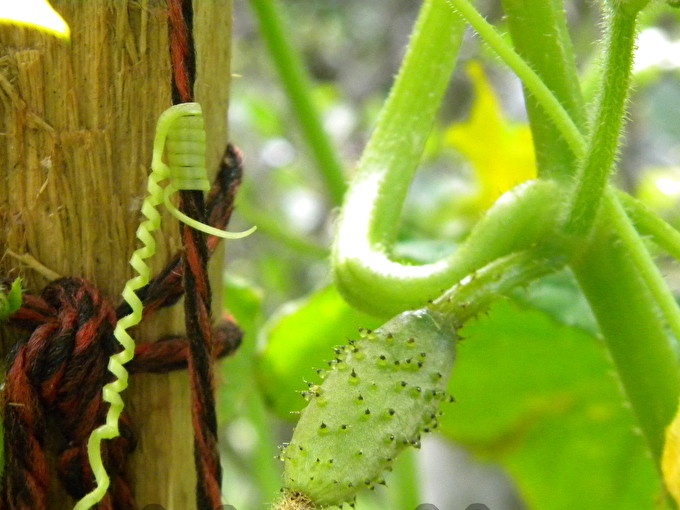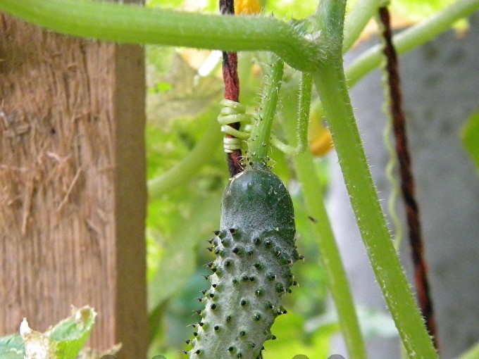 Door de touwen vast te houden en stevig vast te houden met hun antennes, zullen de komkommers beginnen te bloeien. Welnu, in plaats van de bloemen verschijnen de eierstokken van kleine komkommers.