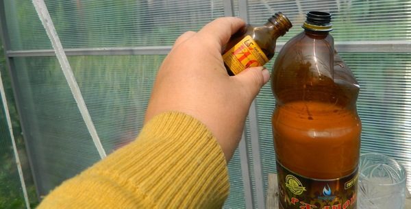 Een dergelijk mengsel kan de ziekte vernietigen en omgaan met de invasie van bladluizen. De toepassing ervan beschermt de cultuur en verzadigt deze met de nodige sporenelementen.