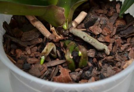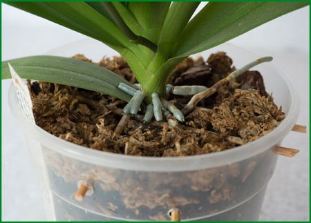 Voordat je een orchidee transplanteert, moet je de wortels zorgvuldig onderzoeken, alle gewonde of uitgedroogde en vervallen processen verwijderen, houtas op het deel van de snede gieten. De capaciteit om dwerg phalaenopsis te planten moet in de schors worden geplaatst en in die gebieden waar het tussen de schors en het wortelsysteem blijft, moet mos worden geplaatst.