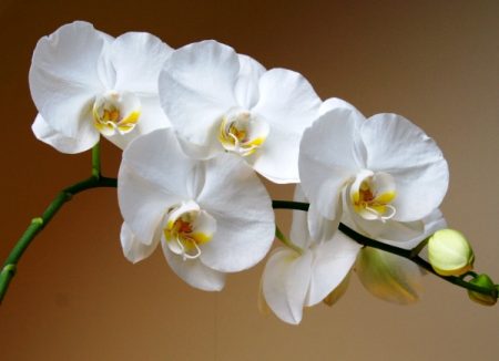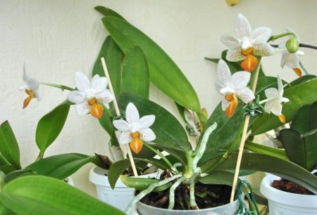 Deze orchideeënvariëteit is het meest geschikt voor het maken van hybriden.Phalaenopsis geeft grote witte bloemen met een diameter van 10 cm De geur is aangenaam, niet uitgesproken. Het ras is meer geschikt om thuis te fokken, omdat het als minder grillig wordt beschouwd dan de rest.