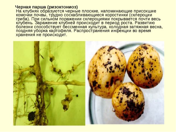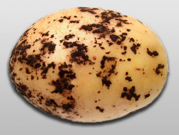 - Slaapfase. Dit is zo'n aandoening van rhizoctonia, die zich in de vorm van sclerotia bevindt. Visueel kun je ze gemakkelijk detecteren, omdat sclerotia eruit zien als de zeer zwarte vlekken die op de aangetaste aardappel verschijnen. Het was vanwege de visuele perceptie dat dergelijke vlekken de "zwarte korst" werden genoemd. Houd er rekening mee dat als je in dit stadium aardappelen verslaat, je dit materiaal nooit moet planten, omdat het naburige wortelknollen kan infecteren.