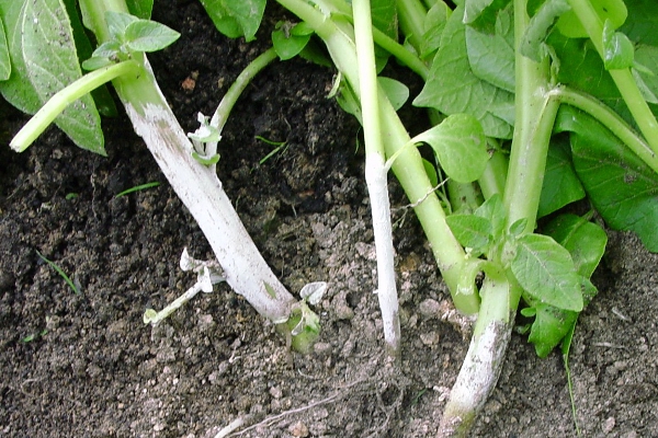 - Fokfase. Het begint met de ontwikkeling van het zogenaamde "witte been". Het vertegenwoordigt de reproductie en verspreiding van schimmelsporen, die zich alleen kunnen ontwikkelen in een gunstige omgeving, namelijk in de aanwezigheid van een hoge luchtvochtigheid en luchttemperatuur van 20 graden Celsius. In dit ontwikkelingsstadium kunnen we stellen dat de plant volledig is geïnfecteerd en dat deze met spoed moet worden verwijderd voordat de schadelijke bacteriën op de aangrenzende aardappel zijn overgebracht.