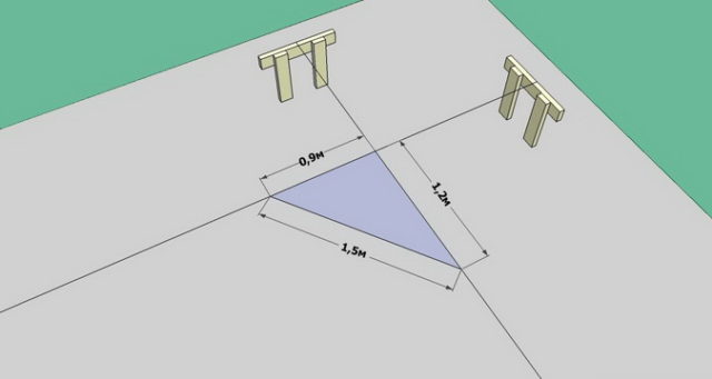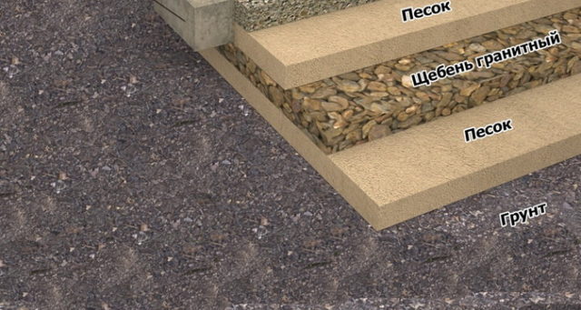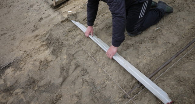 - Markering. De plaats voor opstelling is geëgaliseerd en vrijgemaakt van planten. De grenzen van de patio moeten duidelijk worden gedefinieerd, omdat deze plaats 10 cm onder het grondniveau moet zijn.Een herbicide spray wordt aangebracht, vervolgens wordt de site bedekt met zand, bevochtigd en weer geëgaliseerd.