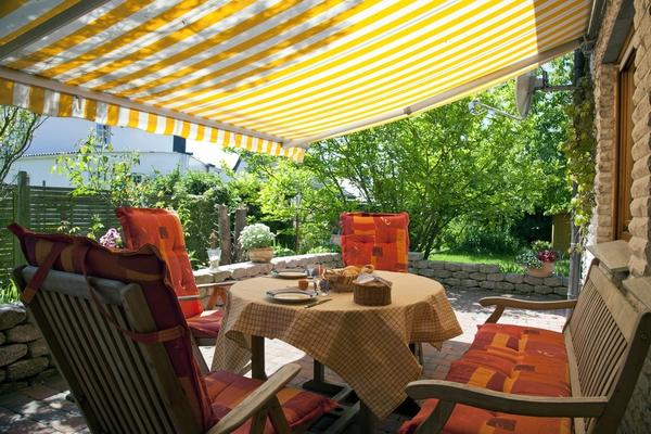 De ruimte naast het huis impliceert de afwezigheid van een baldakijn, in regenachtige gebieden zou een dergelijke oplossing eenvoudig onpraktisch zijn. Hoe maak je dan een terras met een dak in het land met je eigen handen, zodat de tuin er in werkelijkheid en op de foto aantrekkelijk uitziet? Een uitstekende oplossing zou een afneembaar dak zijn. Het wordt kant-en-klaar verkocht en presenteert een stoffen luifel die automatisch of handmatig uitschuift. De marquise is bevestigd op rekken of grenst aan een muur van het huis. Met behulp van zo'n luifel is het mogelijk om tegen de zon en regen te beschermen.