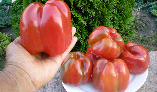 De hybride variëteit rechtvaardigt zijn naam volledig, de vruchten zijn groot, vlezig, dikwandig (tot 13 mm), kubusvormig, met een gewicht tot 300 g. Tot 8 kg fruit wordt met de juiste zorg uit een struik verwijderd. Kleuren kunnen rood, geel of oranje zijn.