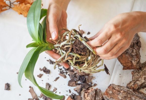 - Nadat je de orchideeën water hebt gegeven tijdens de transplantatie, moet je de inhoud van de pot iets met je vingers kneden en proberen het oude substraat grondig te roeren. Pas daarna kun je de plant voorzichtig uit de bak halen.