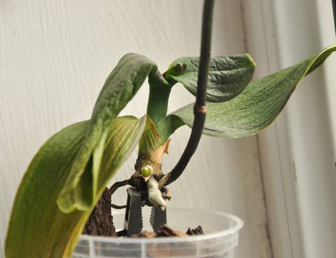 Het is moeilijk om een mini-orchidee te transplanteren zodat deze stevig in de grond is bevestigd. In de begindagen kan het naar de zijkant worden gericht. In dit geval moet je de stam met een zacht touw of kousenband aan de rand van de potmuur binden, je kunt deze niet eerder verwijderen dan na 2-3 maanden.