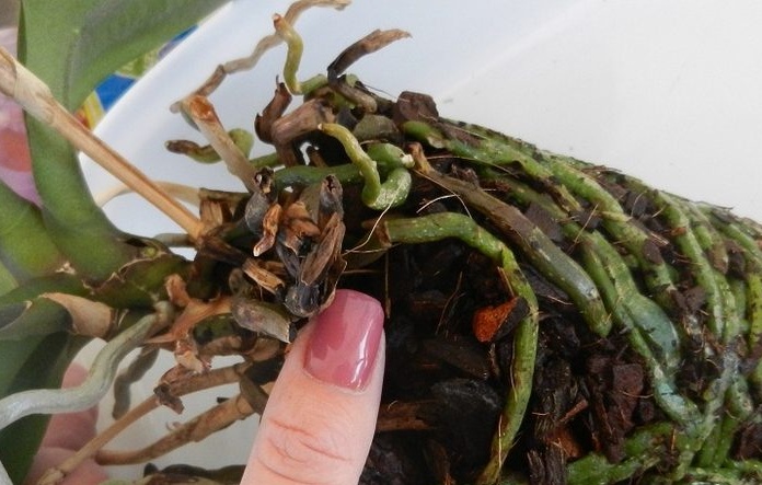 - orchideeëntransplantatie thuis werd met een lange vertraging uitgevoerd, het grootste deel van het wortelstelsel was inmiddels al in staat om te rotten;