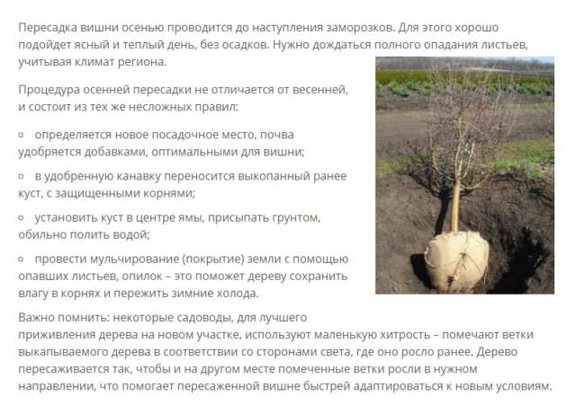 - De aanbevolen transplantatie van kersen in de herfst naar een nieuwe plaats wordt alleen op vooraf afgesproken data uitgevoerd.