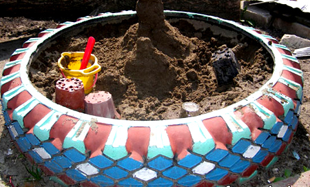 Je kunt ook een kleine zandbak voor kinderen maken van de band. Het principe hier is hetzelfde als bij het creëren van bloembedden, maar nu hoeven planten niet te worden geplant.