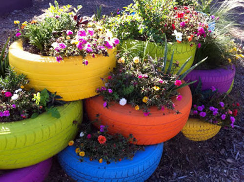 Van hen kun je niet alleen bloembedden maken, maar ook een hele bergheuvel. Graaf gewoon een bandje in de grond en vul ze met aarde en plant daar de planten. Nogmaals, vanuit het oogpunt van esthetiek zullen alleen de banden er niet erg aantrekkelijk uitzien, dus het is het beste om ze in een bepaalde kleur te schilderen of zelfs een ornament aan te brengen om de banden te lakken.