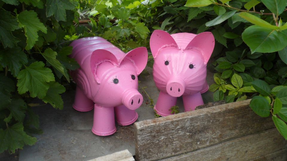 Vooral populair zijn ambachten in de vorm van dieren, die bloembedden en rustplaatsen in het land kunnen versieren. Helderroze biggen zien er leuk uit. Voor de vervaardiging hebt u de materialen en onderdelen nodig die op de foto worden getoond: