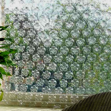 U kunt versieren met ambachten uit plastic flessen, niet alleen het landschap, maar ook het interieur van het landhuis. Makkelijk te maken de gordijnen. Om dit te doen, heb je niet de hele fles nodig, maar alleen de onderkant. Geschikte componenten in verschillende kleuren, vormen en maten. De bodems zijn met draad aan elkaar bevestigd. Desgewenst kunt u een mooi patroon met acrylverf aanbrengen.