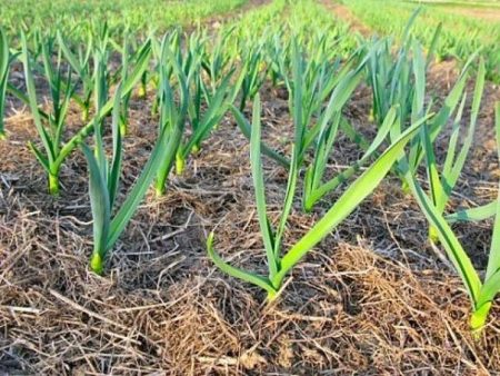 - Siderata (witte mosterd, bonen, erwten) wordt gezaaid om de grond in de bedden te verrijken met knoflook. In het voorjaar wordt de grond uitgegraven, terwijl tegelijkertijd organisch materiaal wordt geïntroduceerd en in rijen kunstmestplanten wordt geplant, waardoor er tussen de rijen ruimte overblijft voor het planten van knoflook. Wanneer het gras tot 20 cm groeit, beginnen ze knoflook te planten.