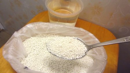 - Topdressing nr. 1 activeert bladgroei, daarom worden meststoffen met stikstof gebruikt - ureum (ammoniumnitraat) - 15 g / 10 l / 3 m².
