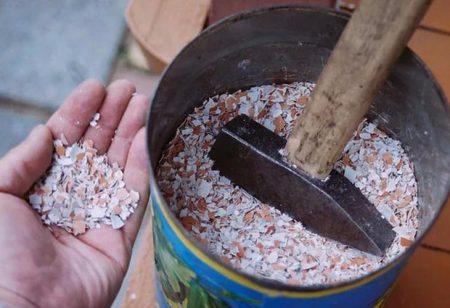 Nadat je de schaal moet strekken en in papieren zakken moet stoppen. Voor het malen kunt u een deegroller, een koffiemolen of een vleesmolen gebruiken. Hoe kleiner de stukken, hoe beter de meststof.