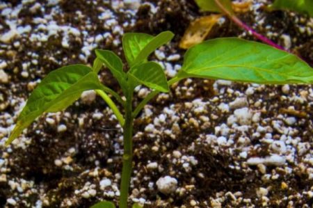 De volgende keer dat de peper 10 dagen na de eerste voeding extra voeding krijgt. Op dit punt zou het al 4-5 echte bladeren moeten hebben. Deze keer wordt een oplossing bereid uit ½ theelepel ureum, kaliummonofosfaat en een liter water.