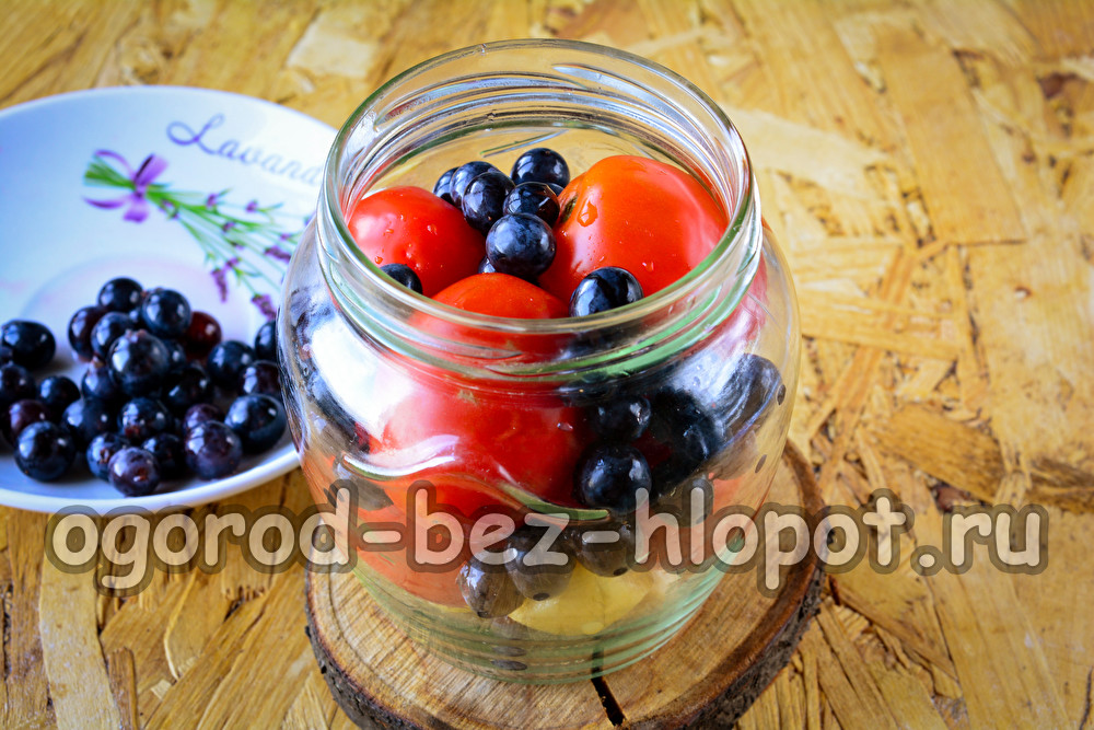 We stoppen tomaten in potten en druiven in de ruimte ertussen. Zo vullen we de pot strak, zonder gaten. Het is beter om kleine tomaten te gebruiken, ze zullen zich beter in potten nestelen.