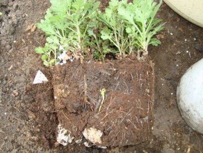 - hak met een schop de wortels af die zijn geselecteerd voor het verplanten van de stekken rond de omtrek van 20-30 cm. Hierdoor kan de chrysant sneller wortel schieten vanwege de vorming van nieuwe wortels. Als de grond droog is, moet je eerst onder de wortel van het water gieten en vervolgens voorzichtig een steel met een brok aarde graven;