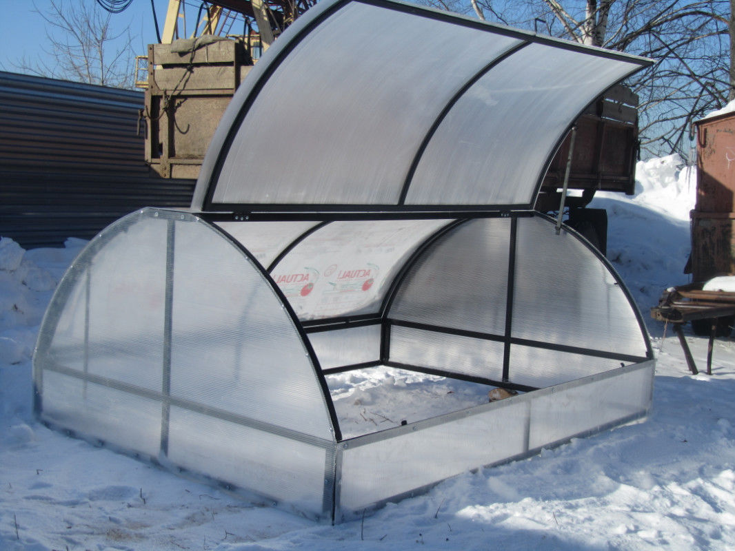2. Snijd polycarbonaat en maak op panelen op een afstand van 5 cm van de rand van het gat. Bevestig het frame aan de fundering, gebruik hiervoor schroeven.