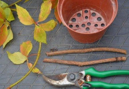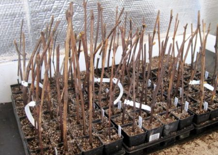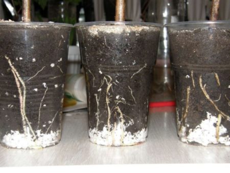 Stekken die al wortels hebben gevormd, worden onmiddellijk getransplanteerd in containers met de grond, waar ze zullen groeien tot het voorjaar planten. Het containervolume moet van 500 ml tot een liter zijn, het kan iets meer, er worden gaten in de bodem gemaakt en een drainagelaag wordt gelegd. Het grondmengsel kan worden gemaakt van turfgrond, zand en een mengsel van zaagsel, gemalen droog gebladerte en organisch materiaal (1: 2: 1). Sommige wijnbouwers nemen gewoon tuingrond.