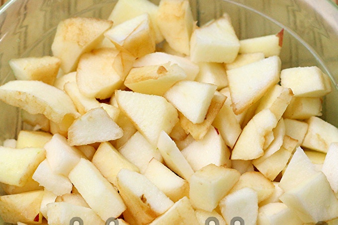 We snijden de schil van appels, snijden gepeld fruit in plakjes, snijden het midden met zaden. Snijd vervolgens in kleine stukjes of dunne plakjes om sneller te koken.