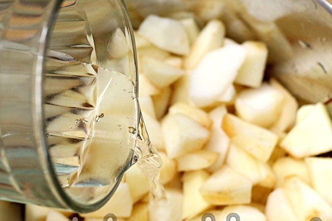 We schuiven de appelschijfjes in een pot of stoofschotels, giet een beetje water. Zelfs als de appels erg sappig zijn, moet in elk geval water worden toegevoegd, anders kunnen de appels bij verhitting verbranden of aan de bodem blijven plakken.