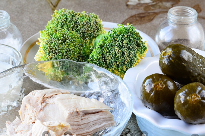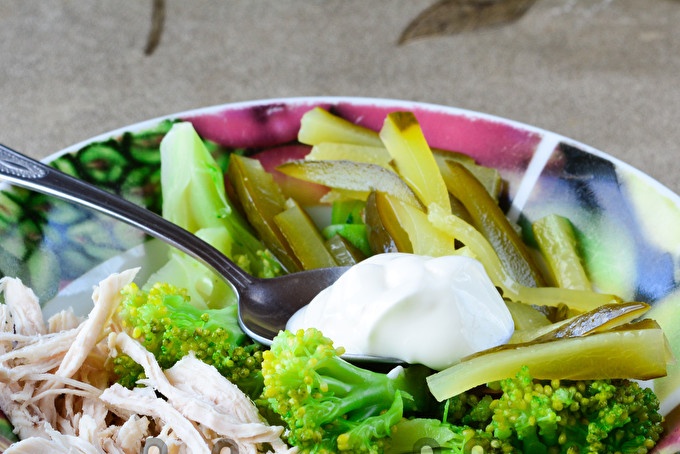 De samenstelling van de salade is vrij eenvoudig: u hebt niet alleen broccoli nodig, maar ook gekookte kipfilet en augurken. Voor de saus nemen we zure room, en niet-vettig, de naam van het gerecht verplicht je immers om jezelf te beheersen en geen vette sauzen te misbruiken.
