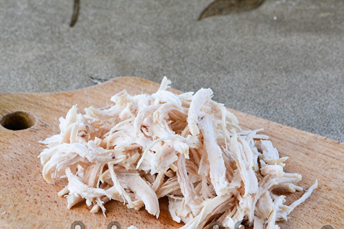Maal voorgekookte en gekoelde kip: scheur of snijd ze in dunne reepjes. Dunne kipvezels zullen het gerecht perfect aanvullen en voedzamer maken.