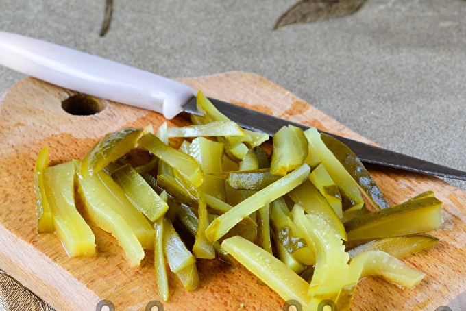 Pickles (snijd pretail van hen) snijd in langwerpige strepen.