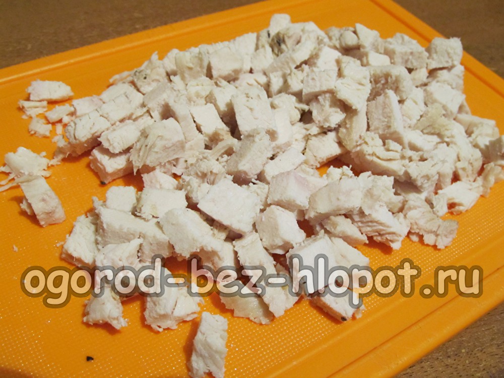 Kook de kipfilet in zacht water tot ze zacht zijn. Om het vlees het lekkerst te maken, voeg je ook laurierblaadjes en een paar erwten piment toe aan het water. Koel het voorbereide vlees en snijd het in blokjes.