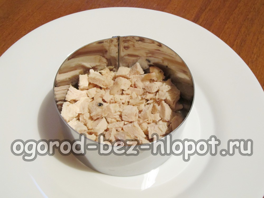 Om de salade mooi en netjes te maken, gebruikt u de zoetwarenring bij het monteren. Zet de ring en leg het gehakte kippenvlees in de eerste laag. Druk goed zodat de filet een dichte laag vormt.