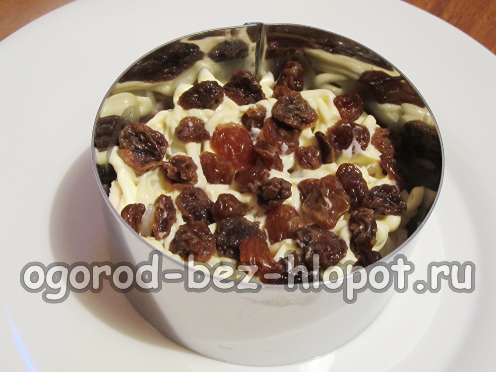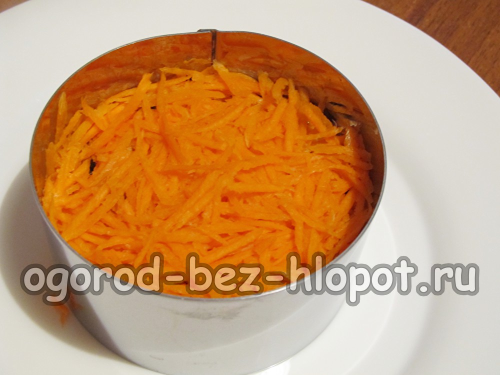 Rozijnen worden gevolgd door een dichte laag verse wortelen, geraspt voor Koreaanse wortelen of gehakte zeer dunne rietjes. Smeer opnieuw met mayonaise.