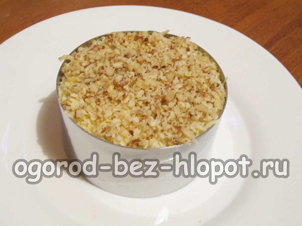 Kant-en-klare salade "Franse minnares" met kip en walnoten, 30-40 minuten in de koelkast zetten, zodat het doordrenkt is en alle smaken onderling "vrienden" zijn. Maak vervolgens voorzichtig los van de zoetwarenring, decoreer zoals je wilt en serveer. Eet smakelijk!