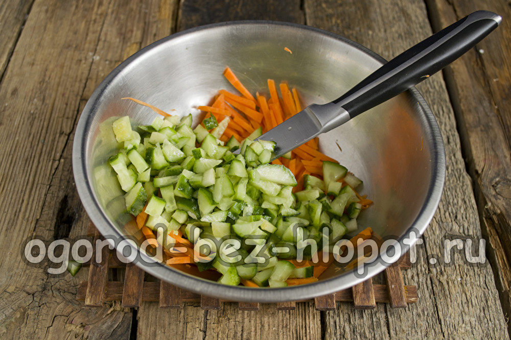Verse stekelige komkommer, snijd de uiteinden. Snijd de komkommer in kleine blokjes. Voeg gehakte komkommer toe aan wortelen.